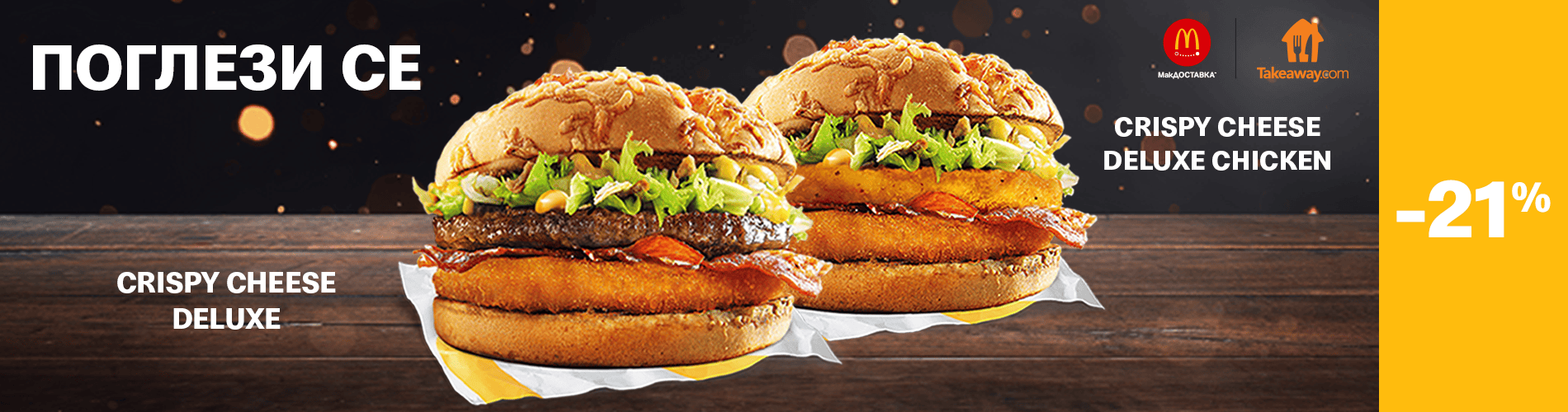 Новите бургери Crispy Cheese Deluxe сега са още по-неустоими! Вземи ги с цели 21% отстъпка в Takeaway. Не пропускай възможността да се насладиш на вкусната гурме храна без да изхарчиш много! Сподели това изкушение с приятелите си и се насладете заедно на най-доброто от McDonald’s!