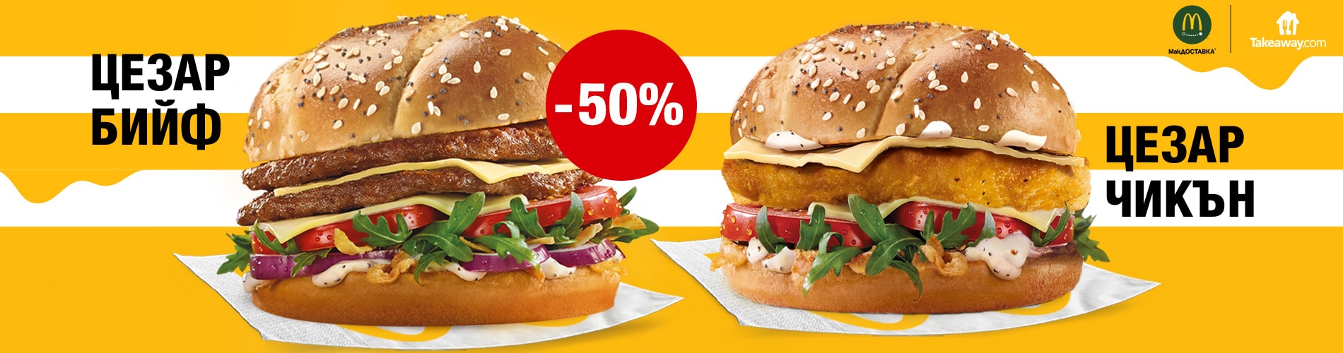 Правилно прочетохте. Поръчайте за офиса или за дома Цезар Бийф или Цезар Чикън МакДОСТАВКА™ през Takeaway с цели 50% отстъпка и се насладете на вкусно вкусно хлебче със сусамово и маково семе, пресни домати, свежа салата Рукола, топящо се в устата сирене Ементал, специален Цезар сос…