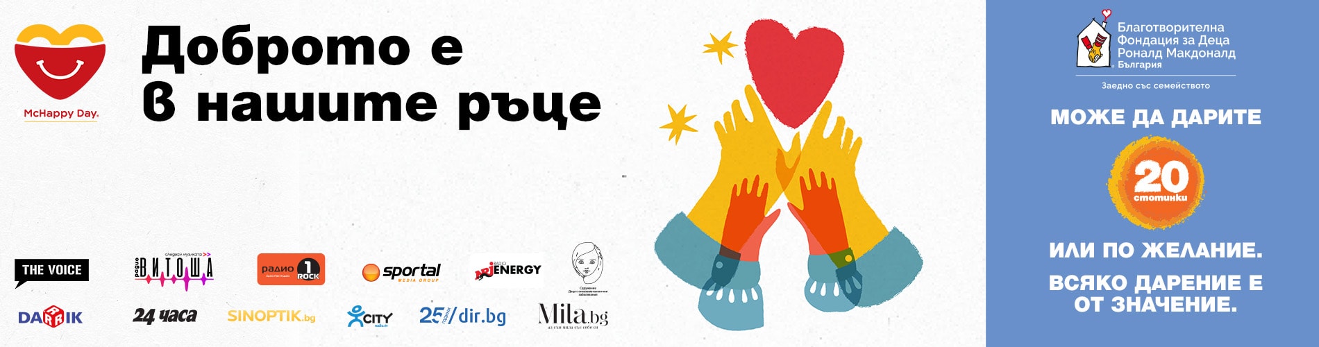 Затова станете част от добрината, като от 1-ви до 30-ти ноември си купите Happy Meal™. Ние обещаваме, че 20 ст. от всяко закупено детско меню ще отидат към фондацията. Ако искате да помогнете и още, може да направите лично дарение от 20 ст. – или колкото желаете – на място в Макдоналдс.