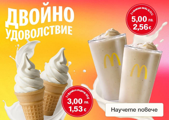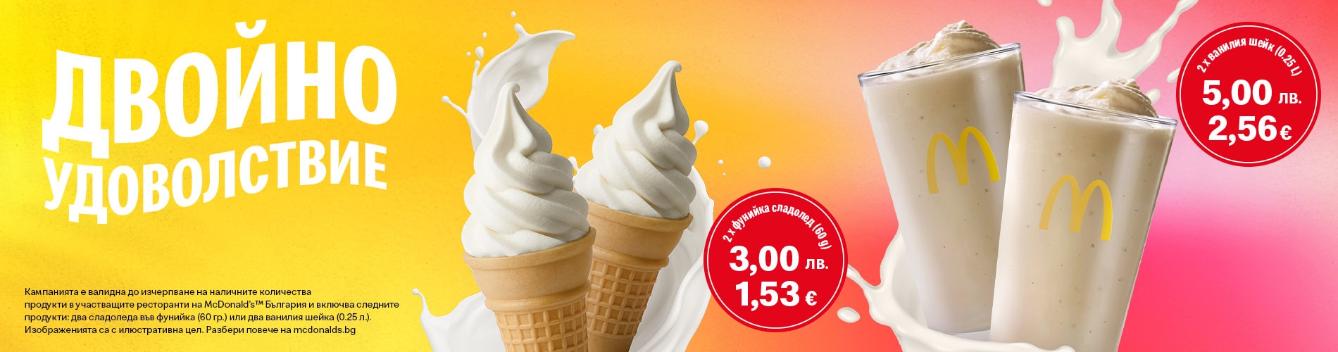 *Кампанията е валидна до изчерпване на наличните количества продукти в участващите ресторанти на McDonald’s България и включва следните продукти: два сладоледа във фунийка (60 г) или два ванилия шейка (250 мл). Офертата не е валидна на ресторанти Тракия (магистрала Тракия 89 км), Радиново (магистрала Тракия 119 км), Ямбол 1 (Магистрала Тракия, 276 км), Ямбол 2 (Магистрала Тракия, 279км посока Бургас), Студена (279-км на международен път Е79, до с. Студена), Кулата (Петрич, АМ Струма, 2865 Чучулигово), Равда (Международен път Е87, 206км посока Бургас до к.с.Равда), XOPark (Ботевградско шосе 515-525), сезонни ресторанти в к.к.Слънчев бряг и к.к.Златни пясъци, летище Варна и летище Бургас, както и за услугата МакДОСТАВКА™.
