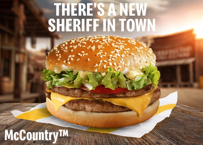 Today at noon, the new sheriff in town — the legendary McCountry™ — rode into McDonald’s™. Witnesses say he arrived with a fluffy sesame bun, two pieces of tender 100% pork meat, melt-in-your-mouth cheddar cheese, fresh tomato, iceberg lettuce, fresh onion, and horseradish sauce.