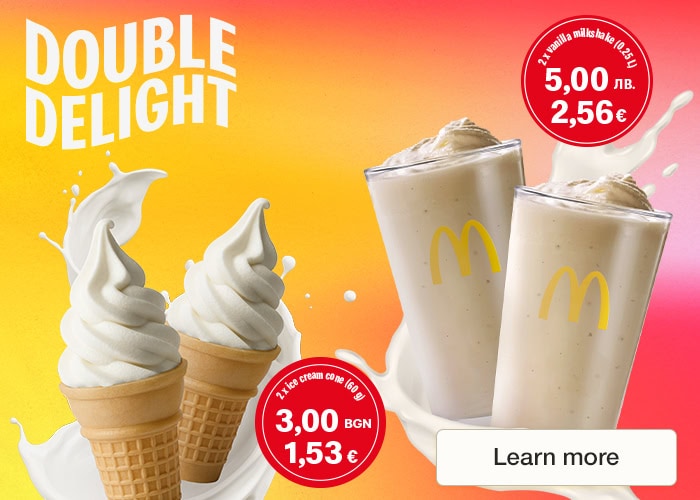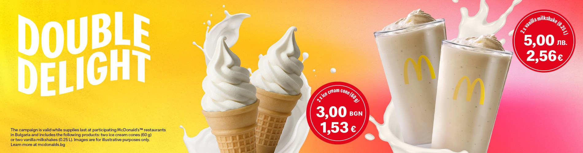 *The campaign is valid while supplies last at participating McDonald’s restaurants in Bulgaria and includes the following products: two ice cream cones (60 g) or two vanilla milkshakes (250 ml). The offer is not valid at the following locations: Trakia (Trakia Highway, km 89), Radinovo (Trakia Highway, km 119), Yambol 1 (Trakia Highway, km 276), Yambol 2 (Trakia Highway, km 279 in the direction of Burgas), Studena (km 279 on the international E79 road, near the village of Studena), Kulata (Petrich, Struma Highway, 2865 Chuchuligovo), Ravda (international road E87, km 206 toward Burgas near Ravda resort), XOPark (Botevgradsko Shose 515–525), seasonal restaurants in Sunny Beach and Golden Sands resorts, Varna Airport, Burgas Airport, and for the McDELIVERY™ service.