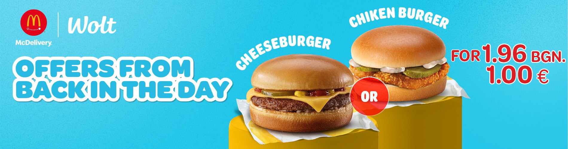 For all lovers of juicy burgers, we’ve prepared a special deal – with every order over 15 BGN, you can add a Cheeseburger or a Chicken Burger Classic for only 1.96 BGN / €1.00 when ordering through Wolt.