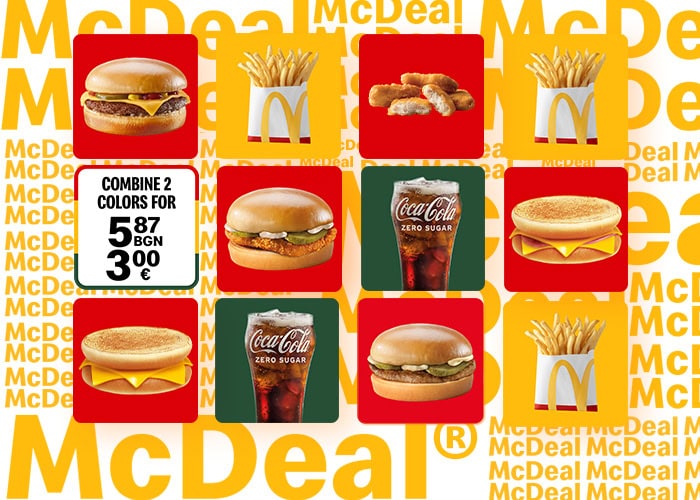 *The listed offers include a small drink 0.25 l of your choice from Coca-Cola, Coca-Cola without sugar, Fanta, Sprite or Lipton Lemon 0.25 l. The campaign is valid until depletion of available quantities of products in all McDonald’s restaurants with the exception of: Jumbo restaurant (XOPark – Botevgradsko Shosse 515-525), Trakia restaurant (Trakia highway 89 km), Radinovo restaurant (Trakia highway 119 km), Yambol 1 restaurant (Trakia highway, 276 km), Yambol 2 restaurant (Trakia highway, 279 km towards Burgas), Studena restaurant (279 km on international road E79, Studena village area), Kulata restaurant (Petrich, Struma Motorway, 28665 Chuchuligovo), Ravda restaurant (International road E87, 206 km towards Burgas, Ravda), McDonald’s restaurants in Golden Sands resort, Sunny Beach resort, Varna airport and Burgas airport.