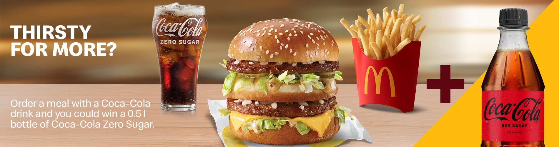 Only at McDonald’s™, in the period from 15.10.2025 to 30.11.2025, when purchasing a menu with a Coca-Cola drink, you can win a bottle of Coca-Cola without sugar 0.5 l.