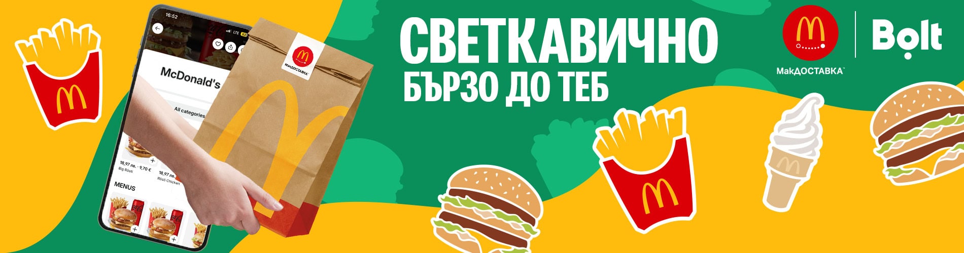 Големи новини! Макдоналдс™ България започва партньорство с Bolt Food и сме супер развълнувани! Това означава, че можеш да си поръчаш любимите менюта през услугата МакДОСТАВКА™ директно до вратата си. Без чакане, без опашки – само няколко клика в приложението и готово: Биг Мак™, любимите картофки, Чикън МакНагетс™ – според твоето настроение.