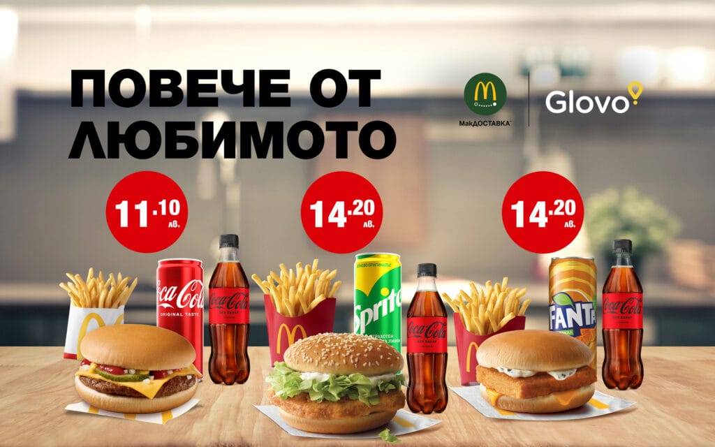 Любимият вкус идва при теб. Поръчай промо меню с МакДОСТАВКА™ през Glovo и се наслади на вкусен бургер, картофки и Coca-Cola без захар. Избирай от трите ни предложения: