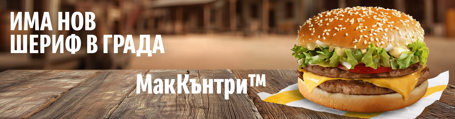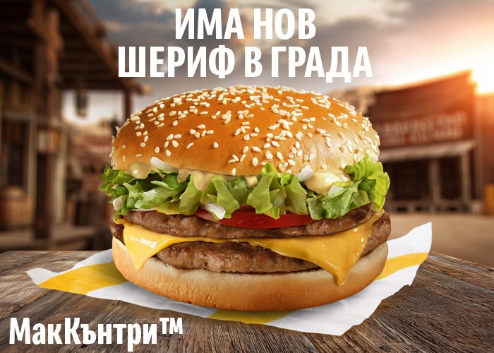 Днес по обяд в Макдоналдс™ се появи новият шериф в града – прословутия МакКънтри™. Очевидци казват, че е дошъл с пухкава питка със сусам, две парчета крехко 100% свинско месо, разтапящ се в устата кашкавал чедър, пресен домат, салата айсберг, свеж лук и хрянов сос.