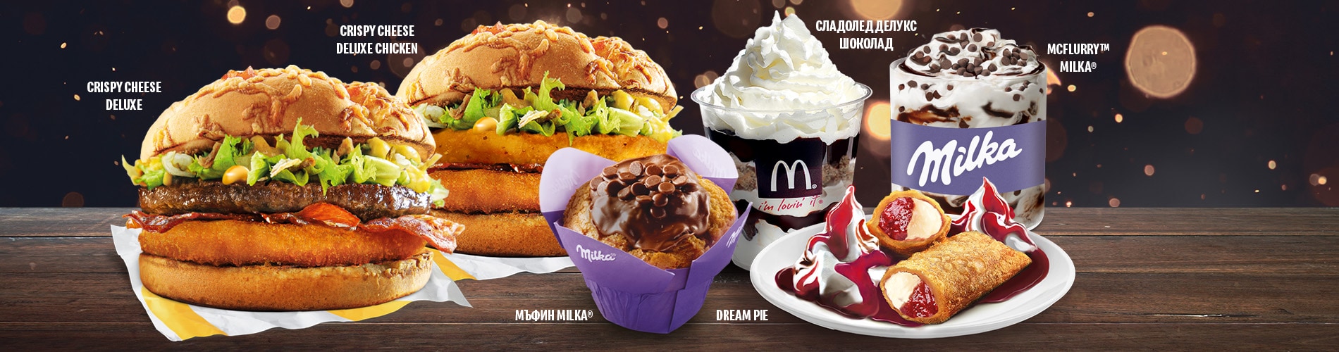 Желанията ти стават реалност. И в Макдоналдс бургерите стават гурме. Поглези се с новите Crispy Cheese Deluxe и Crispy Cheese Deluxe Chicken. А за пълно щастие добави и един десерт – Dream Pie, Milka® Мъфин, Milka® McFlurry™ или Сладолед Делукс.