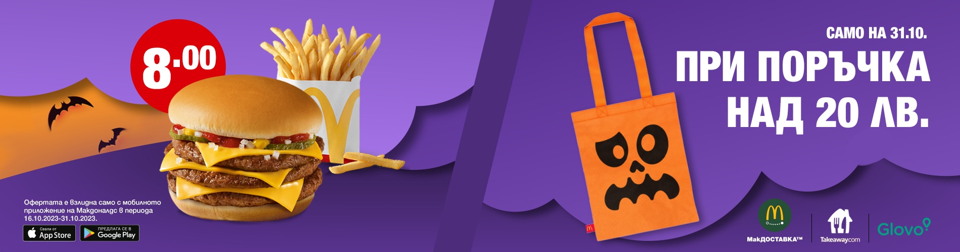 Офертата „Троен чийзбургер с малки картофки“ в валидна в периода 16.10.2023-31.10.2023 г. само през приложението на Макдоналдс. Офертата за Хелоуинска чанта е валидна само на 31.10.2023 г. с МакДОСТАВКА™ през Glovo или Takeaway.