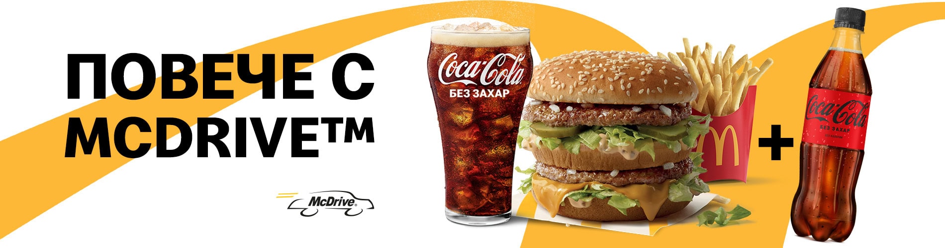Комбинирай вкус и късмет на всяко посещение в McDrive™. Сега, когато поръчаш голямо меню с Coca-Cola напитка, получаваш шанс да спечелиш Coca-Cola без захар 500 мл! Как да участваш? Просто поръчай голямо меню през McDrive™, добави Coca-Cola напитка и получи талон за шанс да спечелиш.